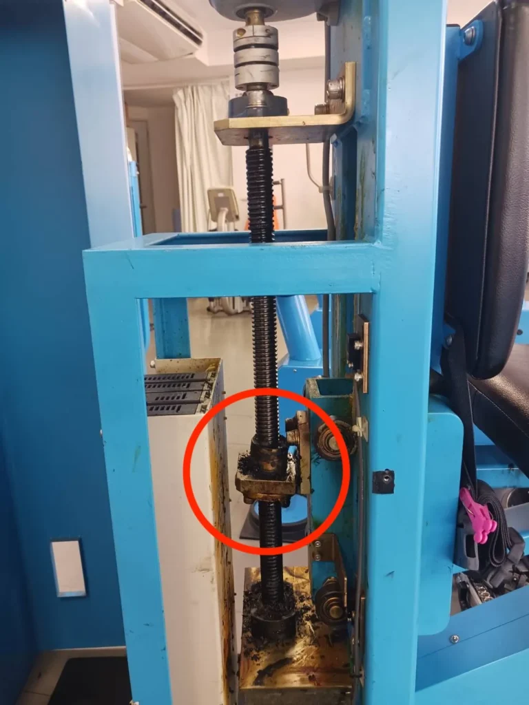 - 座席シートを昇降させる台形ネジナットが摩耗し、固着していた。