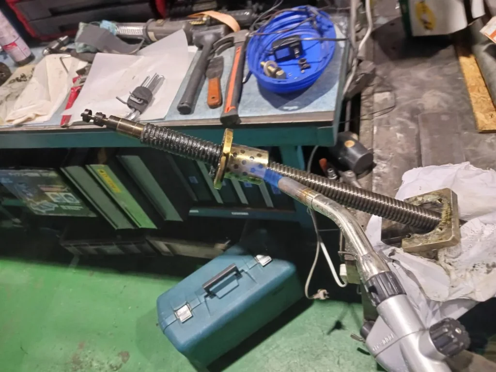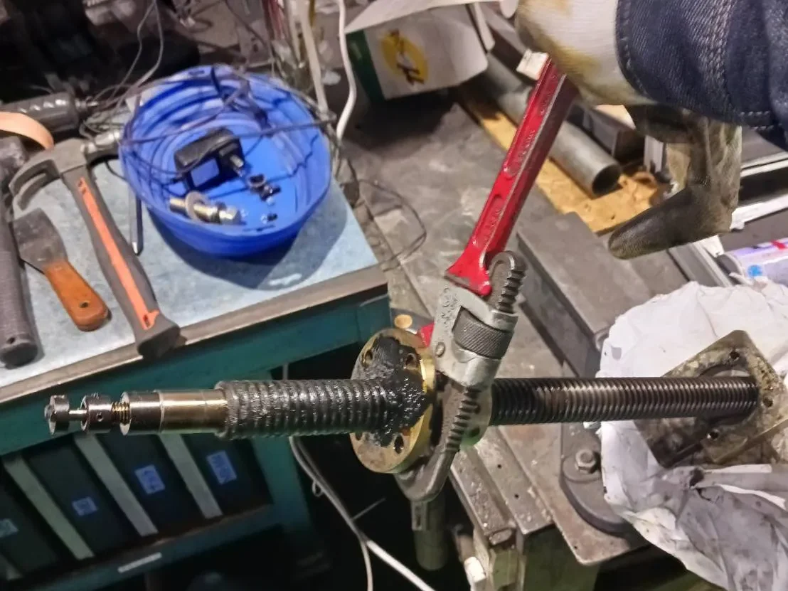 固着したネジナットを現地で取り外すのは困難と判断し、シャフトとナット周辺をアセンブリ(ASSY)ごと取り外し、自社へ持ち帰り。 - ナット交換