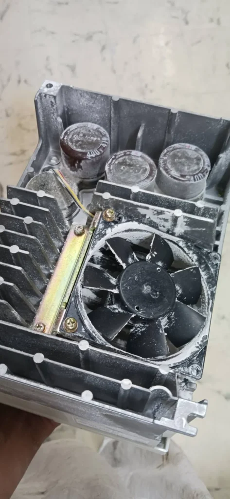 - 旧インバーターの裏面には粉が付着しており、故障リスクが高い状態