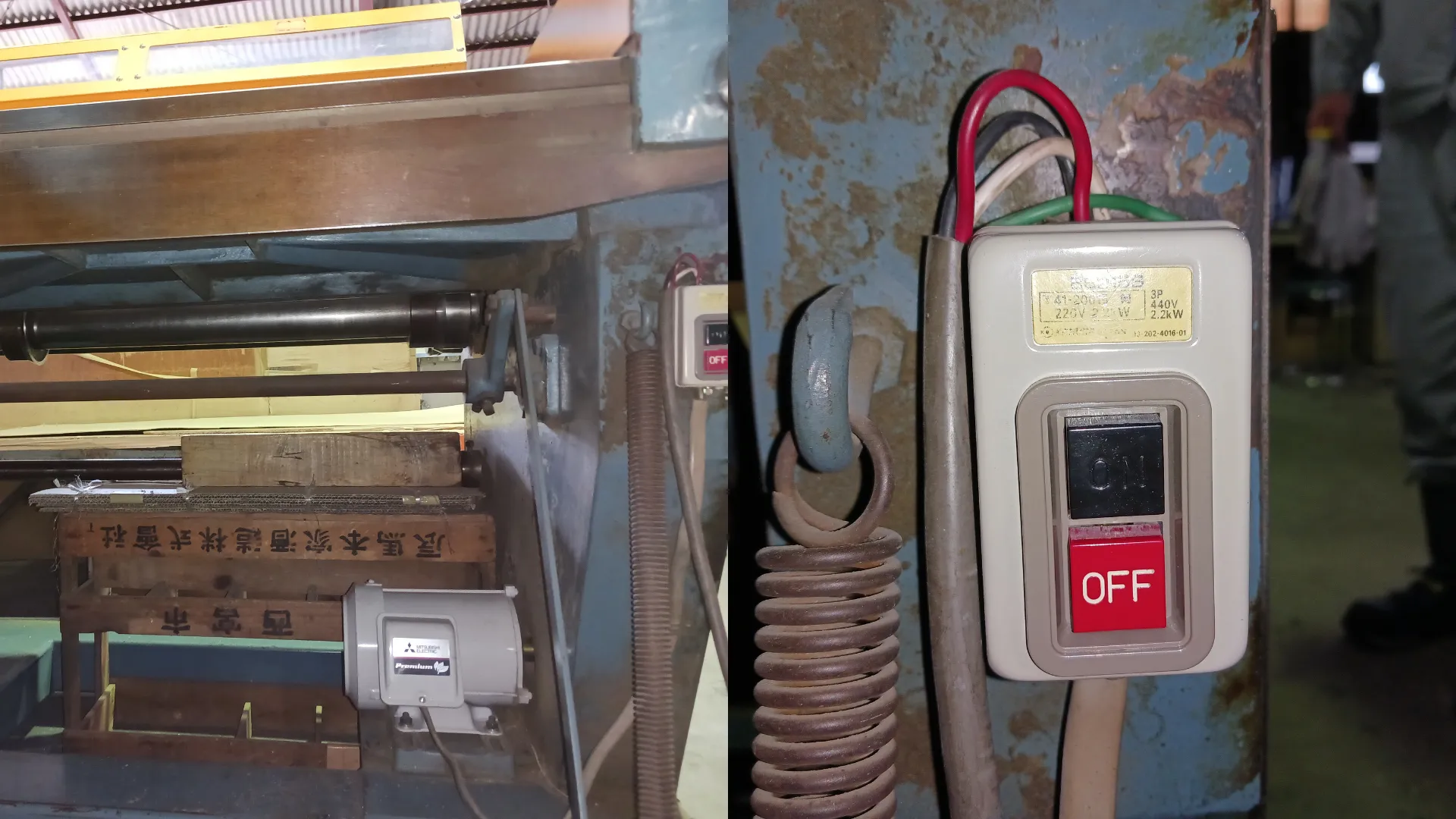 これまでの装置には、モーターを停止させるための小さなOFFボタンしかなく、緊急時に即座に停止操作を行うのが難しい構造でした。