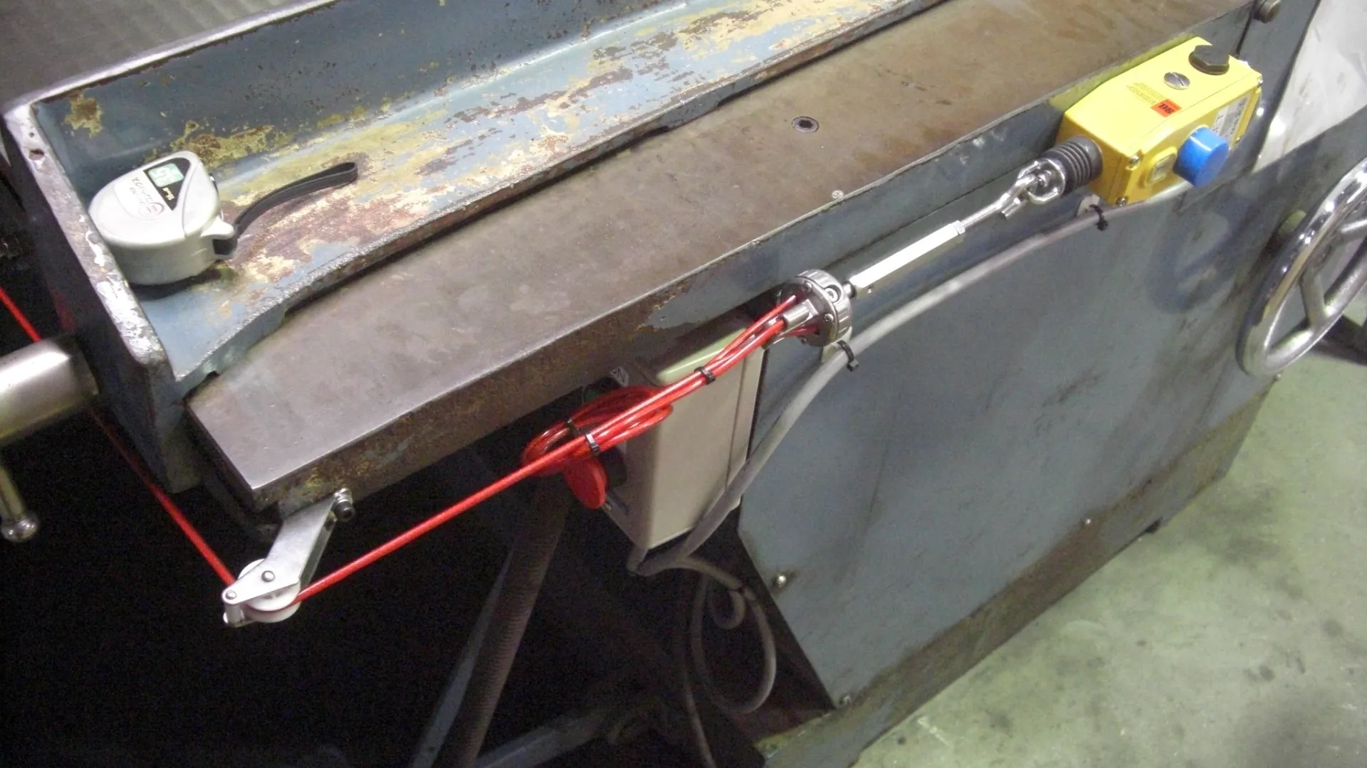 市販のロープ式非常停止スイッチを採用し、裁断機の周囲にコの字型にロープを配置。