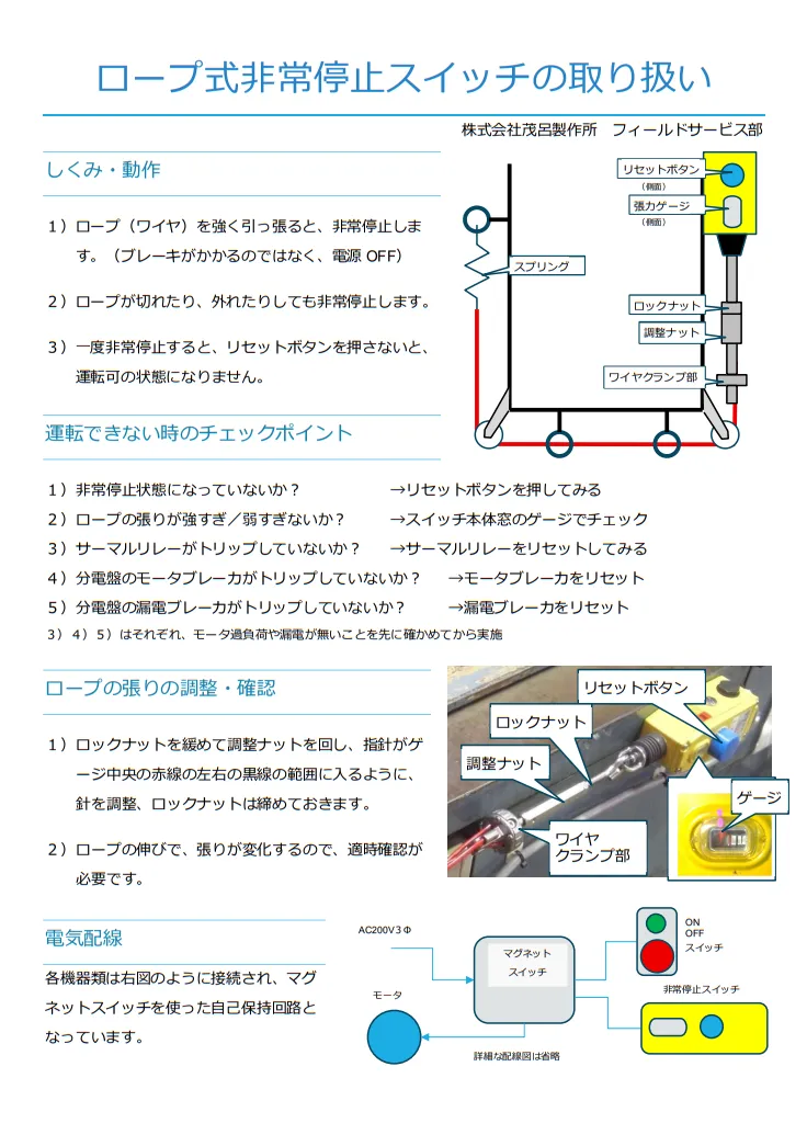 - ロープを引く、または大型の停止ボタンを押すことで即時にモーターへの給電が停止。